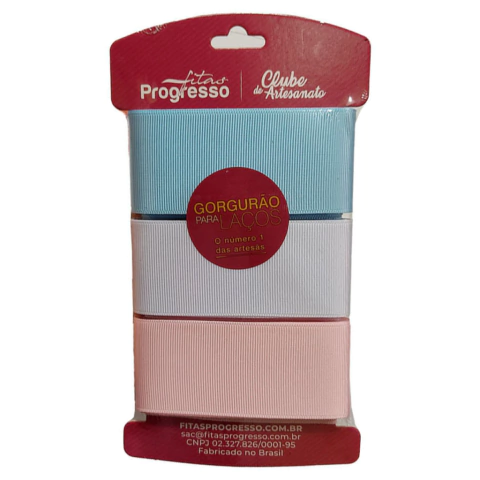 Características do Produto: - SKU: KGL00138-003 - Cores Disponíveis: Azul Bebê 212, Branco 201, Rosa Claro 206 - Largura: 38mm - Comprimento: 9 Metros (3 metros de cada cor) - Marca: Progresso
